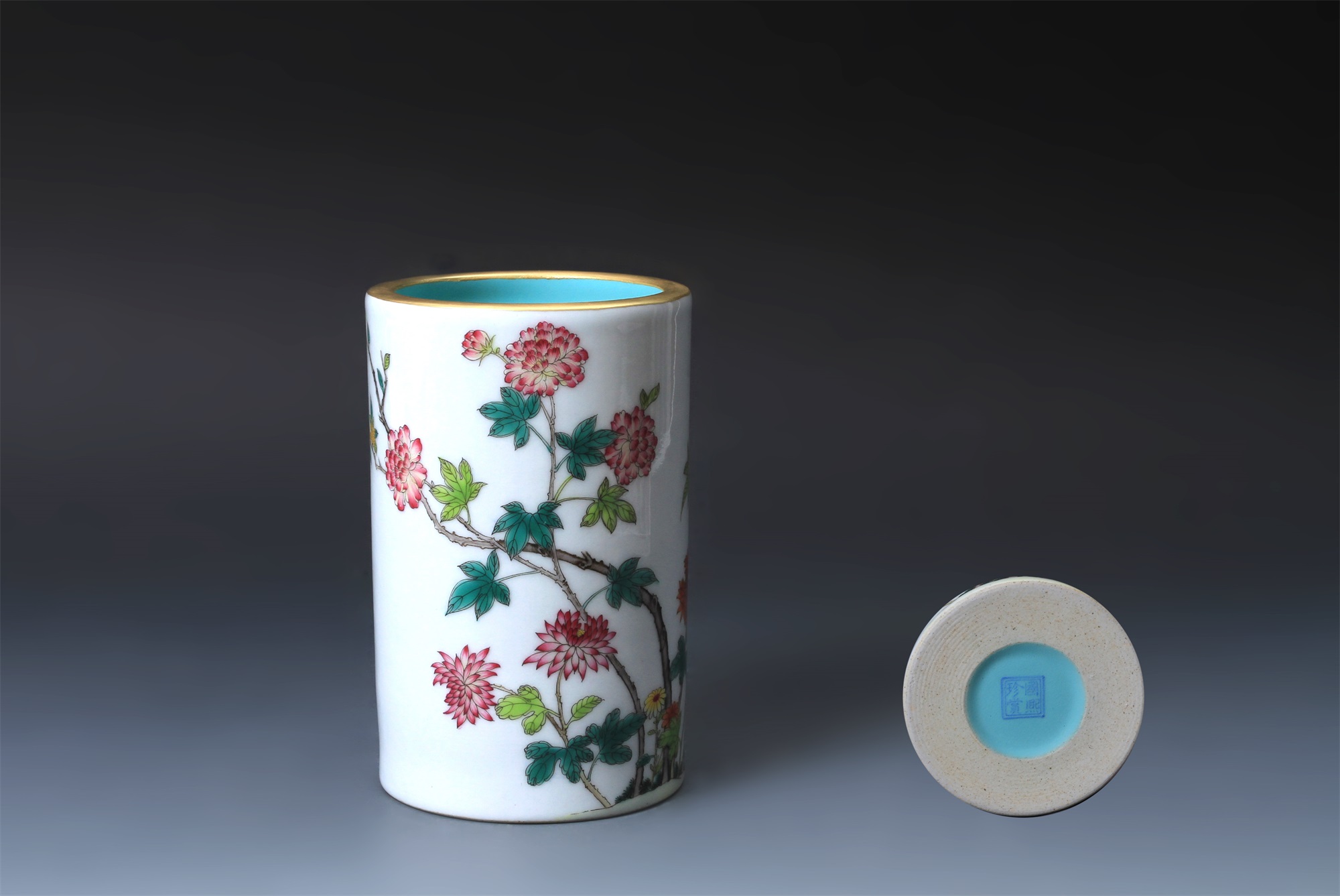 【清乾隆 粉彩四时花卉诗文笔筒】