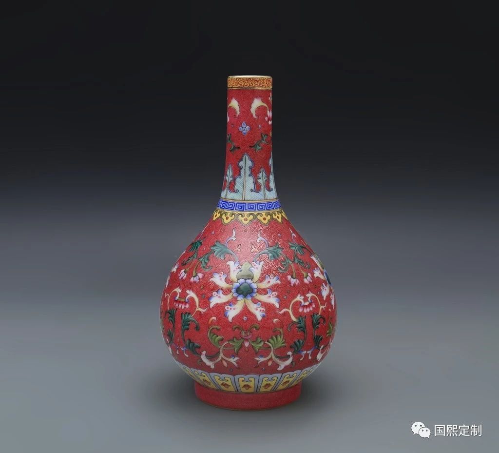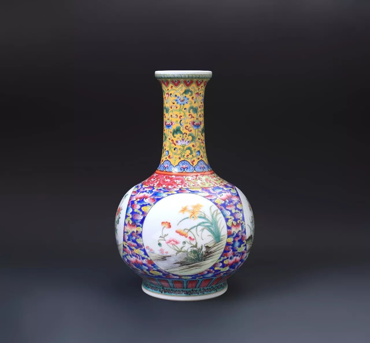 【珐琅彩「祥云瑞蝠」开光「四季花卉」图瓶】
