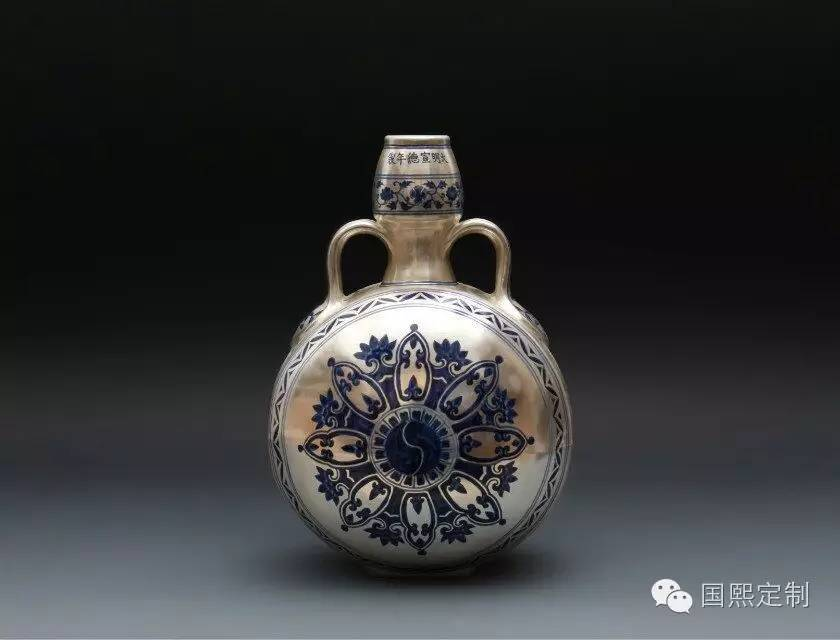 【明宣德 青花银彩 轮花纹绶带耳扁壶】