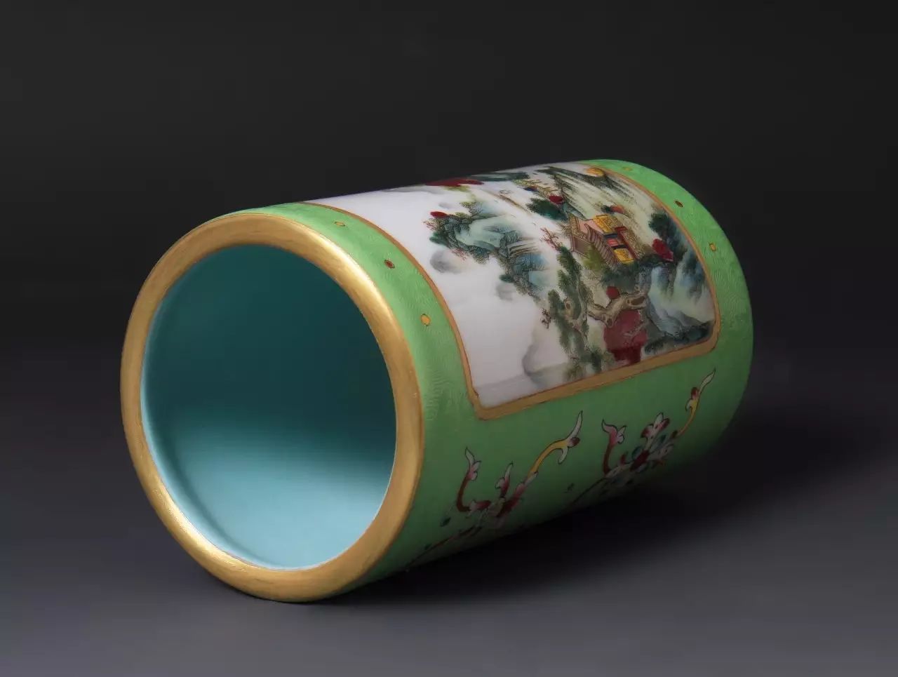 【清乾隆 浅秋葵绿地开光山水笔筒】