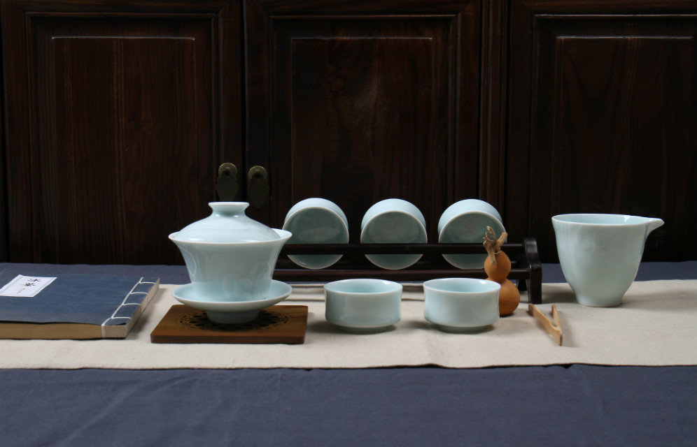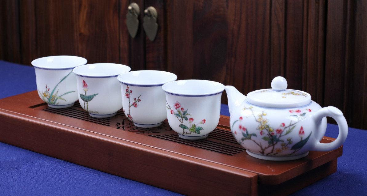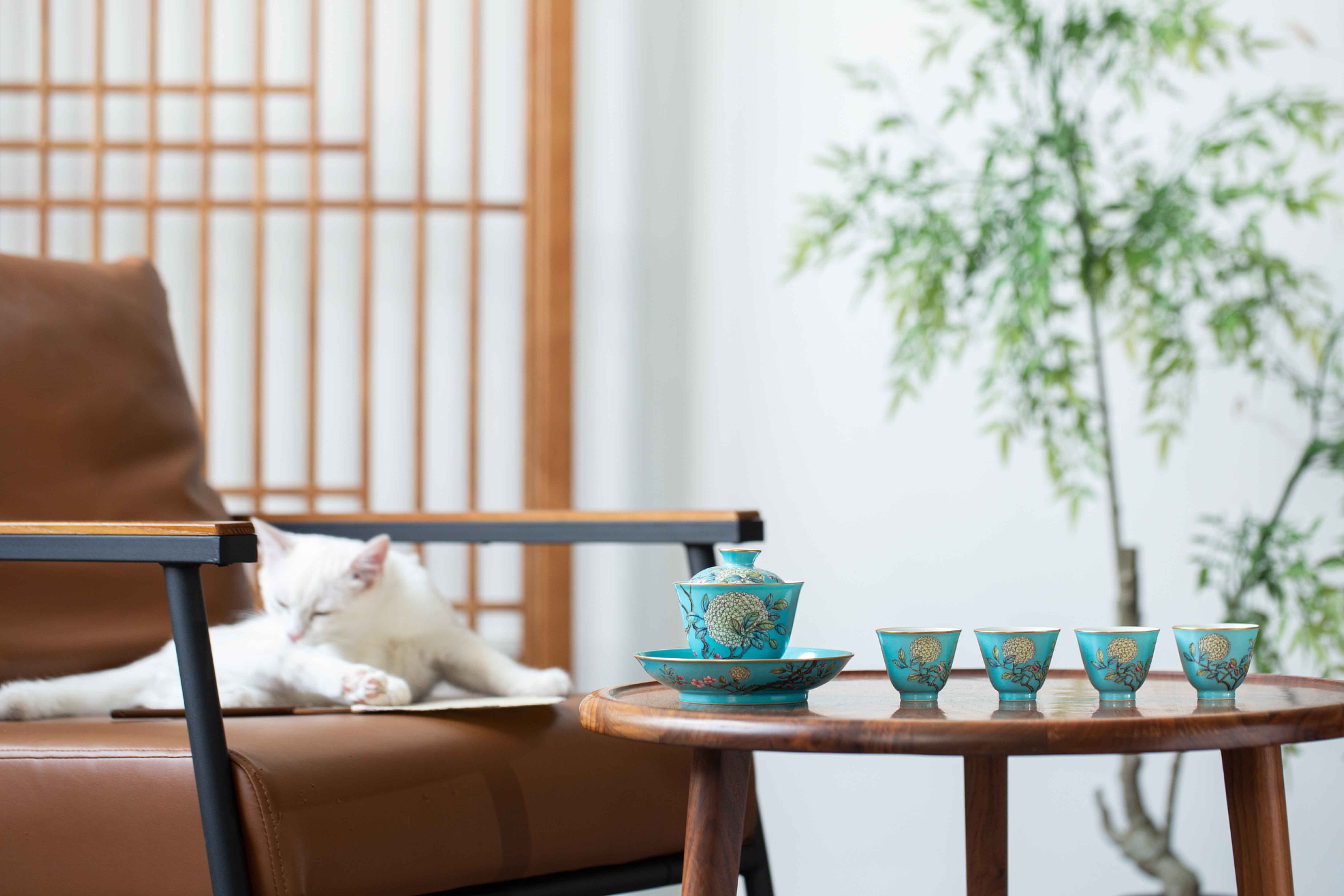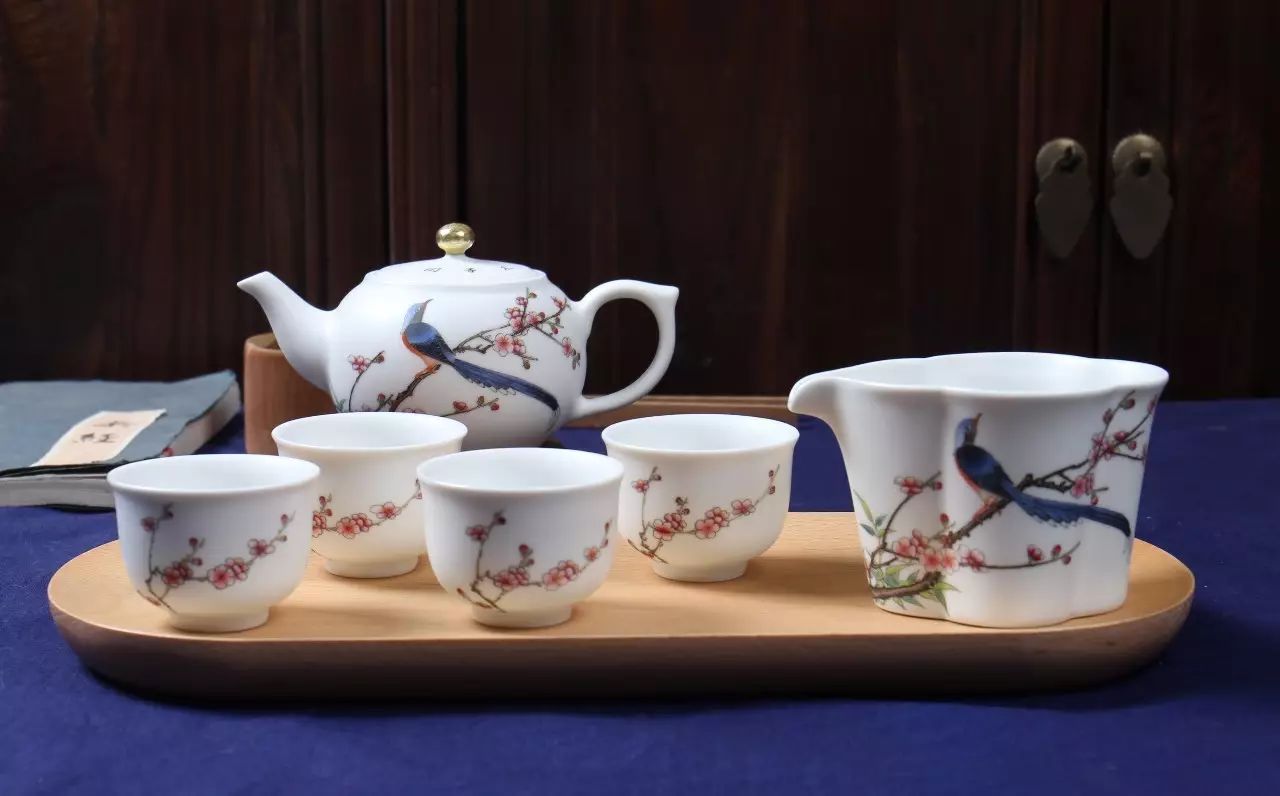 【清乾隆 蓝地粉彩轧道花鸟纹茶具】