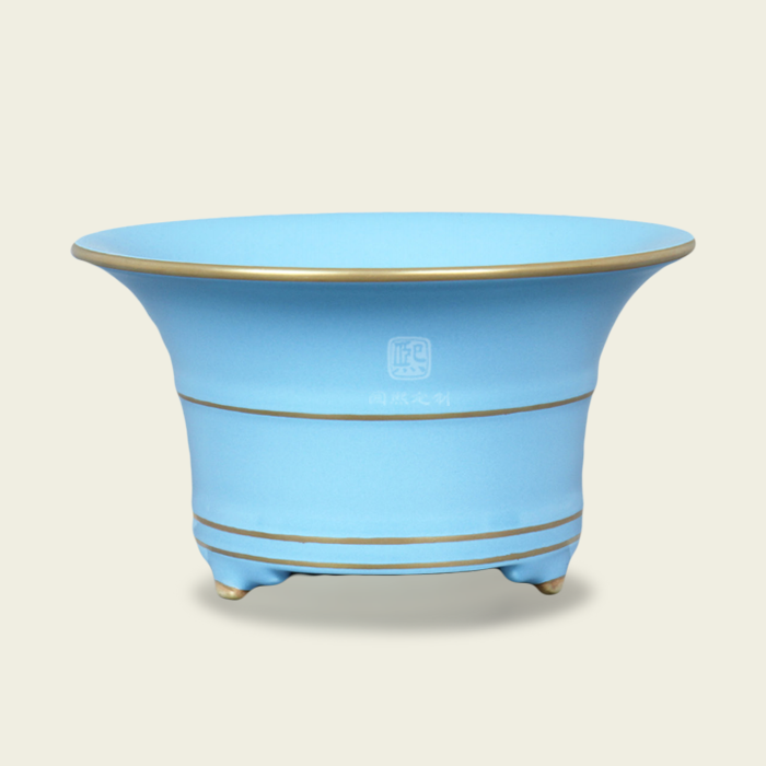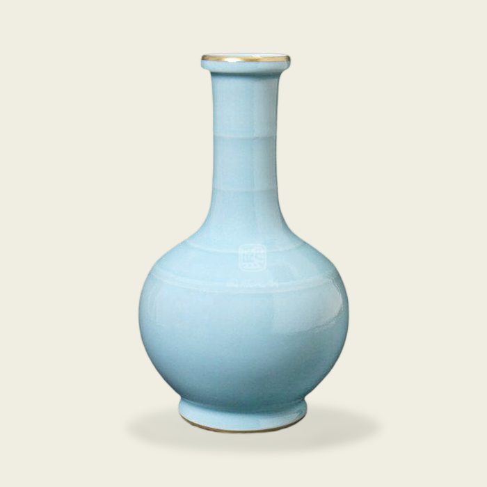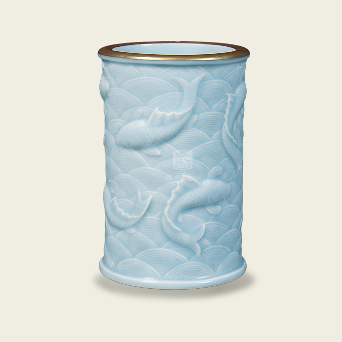 清·乾隆 粉青釉雕刻鱼化龙描金笔筒